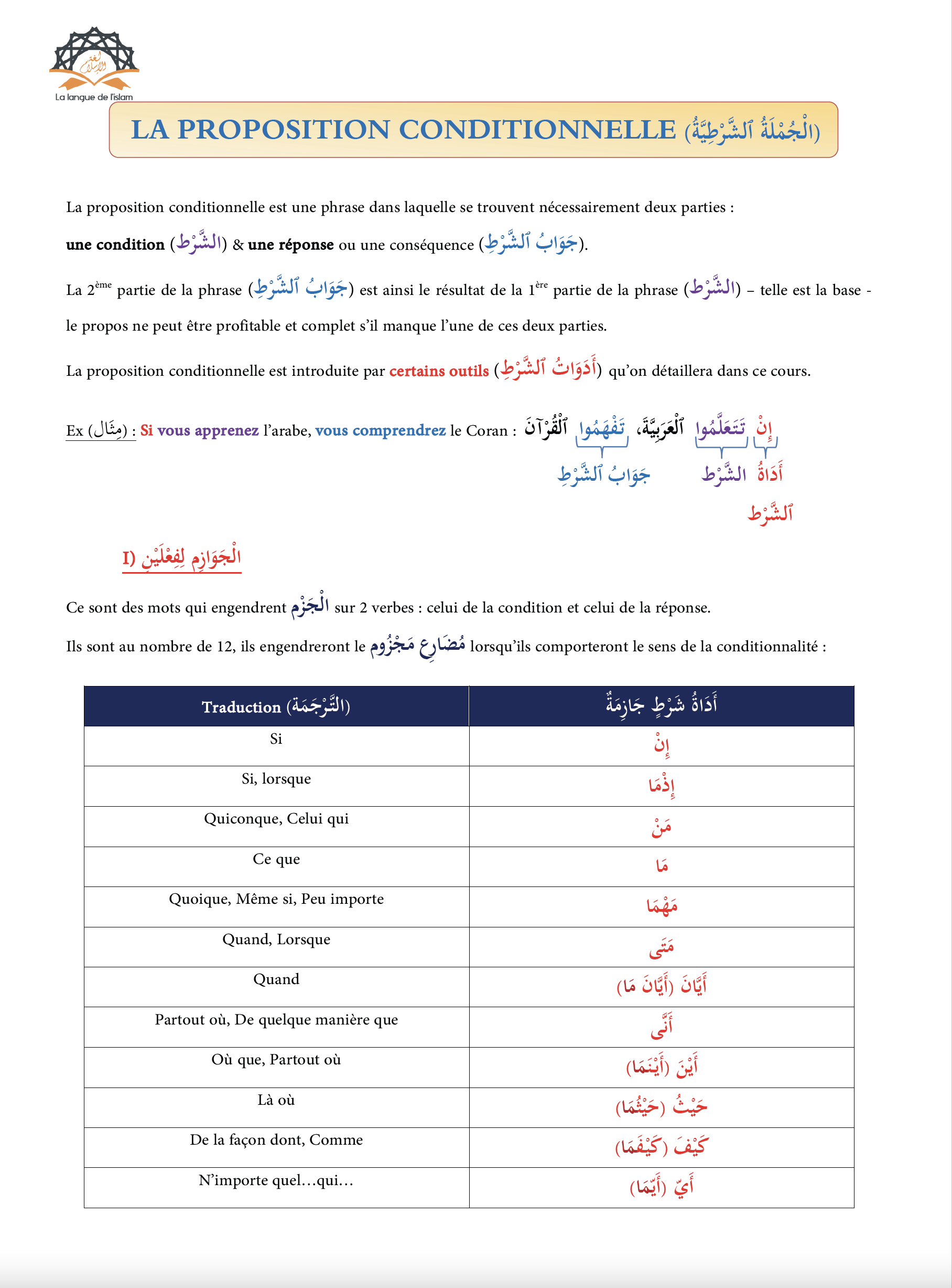 Nous y abordons 1 très grande leçon détaillée (environ 86 pages de cours) selon une méthodologie visant à expliquer les leçons en français tout en utilisant les terminologies propres à la langue arabe afin de donner un maximum de repères à l’étudiant.