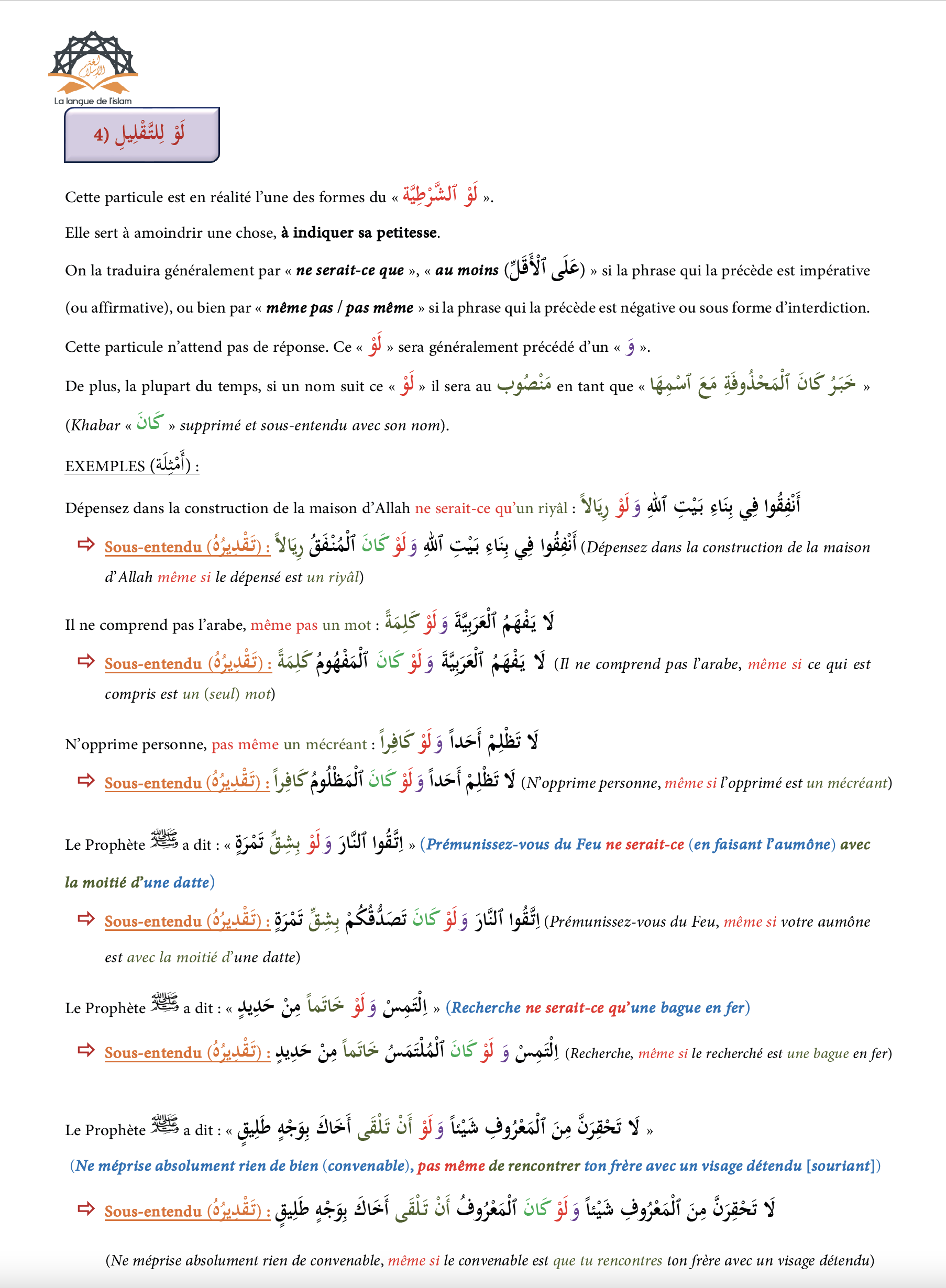 Cette leçon est détaillée, étoffée d’exemples d’application utilisant la traduction du français à l’arabe, appuyée de plusieurs versets coraniques mettant en valeur la règle de grammaire présente dans la leçon en cours.